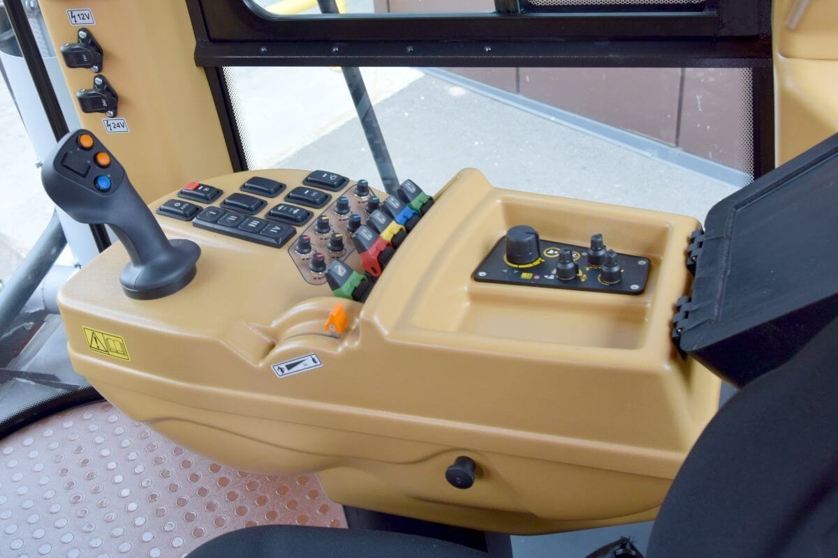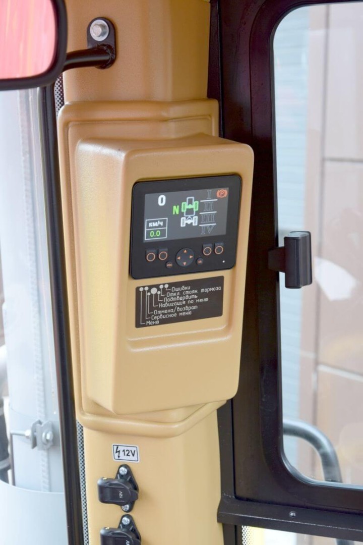 Система управления нового поколения КОМАНДПОСТ-4А: джойстик управления КПП, кнопки управления EHR, навеской и гидравликой рабочего оборудования расположены на боковой консоли справа от кресла оператора.
