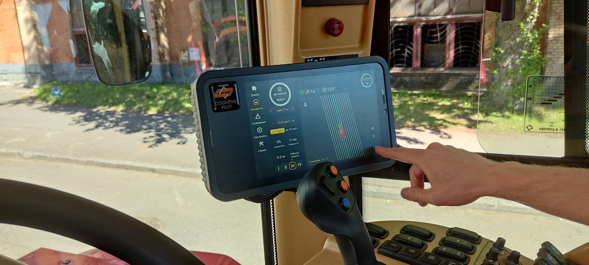 Поддержание заданной скорости движения основано на сравнении заданного значения скорости с текущей скоростью движения трактора, полученной по данным системы спутниковой навигации и данным с датчика скорости трактора. В случае несовпадения значений, КИРОВЕЦ‑АГРОПИЛОТ подает соответствующую команду на систему управления КПП.